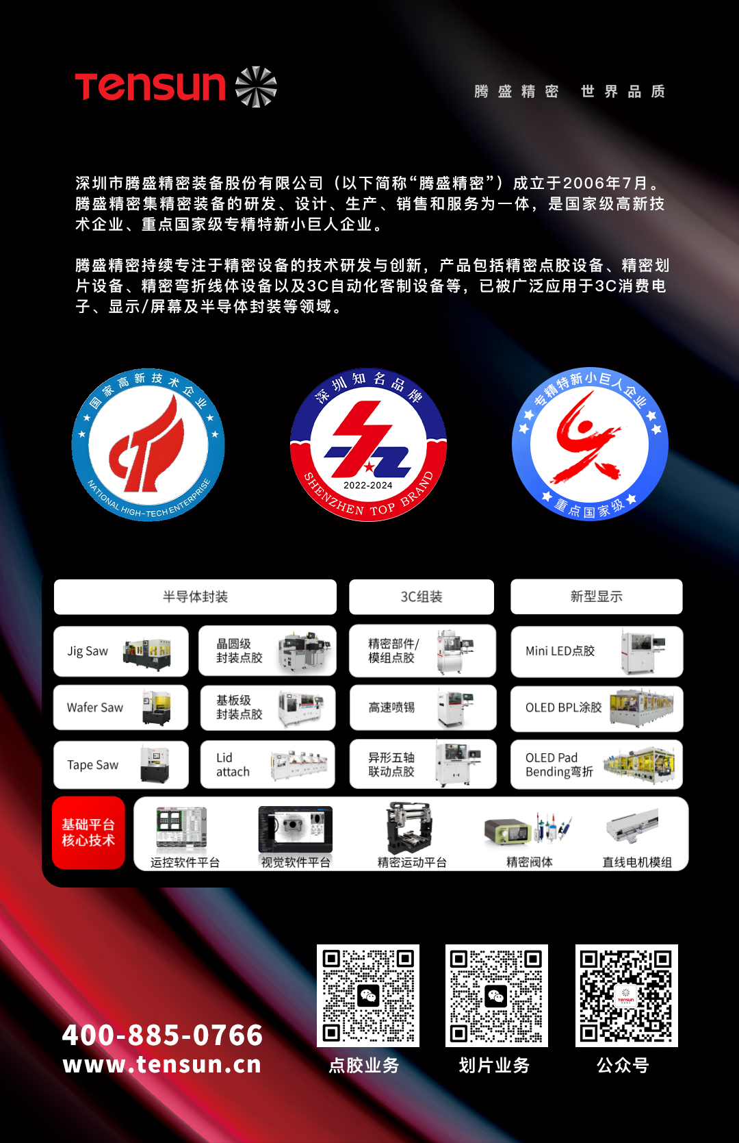 隨著人工智能和5G等新興技術的發展,為了滿足不同材料和工藝的切割需求,對劃片機的精度和速度提出了更高要求,多功能劃片機也將成為研發重點。騰盛精密2014年開始布局泛半導體領域,陸續推出Package Saw和Jig Saw系列劃片設備,從半自動、自動到全自動,騰盛完成了從無到有的自研之路,助力中國半導體精密革命,并進入高端裝備行列。